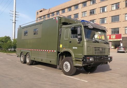 重汽六驅(qū)自行式炊事車越野餐車主要應(yīng)用于重大突發(fā)事故救援,重大戶外活動(dòng),可廣泛應(yīng)用于消防,武警,石油,電力等龐大戶外人員用餐保障。采用重汽豪沃6X6越野底盤(ZZ2257N5857E1),全時(shí)全輪驅(qū)動(dòng)、機(jī)械式、帶軸間差速器及差速鎖,重汽280馬力國五發(fā)動(dòng)機(jī),重汽10檔變速箱,駕駛室準(zhǔn)乘人數(shù)2人另加一個(gè)豪華臥鋪,高車速110公里沒小時(shí),12.00R20 16PR鋼絲胎,主副食加工設(shè)備、面食加工、備配菜設(shè)備、排油煙設(shè)備、電氣系統(tǒng)、供排水系統(tǒng)、供油系統(tǒng)、駐車系統(tǒng)等為一體的野營(yíng)、野外飲食加工后勤保障設(shè)備。采用全自動(dòng)炒菜系統(tǒng),減少炊事員勞動(dòng)強(qiáng)度同時(shí)提高餐品質(zhì)量,可在1h內(nèi)加工制作不少于1000人份的副食,菜品種包括炒菜、燉菜或湯類;在車輛行進(jìn)狀態(tài)下,還可在1h內(nèi)蒸制不低于200kg大米的米飯,同時(shí)可制作不低于300人份的燉/炒菜。2-3小時(shí)內(nèi)可不間斷保障200-300人用餐。 車體附件裝置:水、電系統(tǒng),配備柴油發(fā)電機(jī)、大容積冰箱及不銹鋼水箱,副柴油箱可達(dá)140L,自流郵箱60L。 設(shè)置不銹鋼防護(hù)欄,不銹鋼踏步梯2人可供人員循環(huán)上下,箱體的后部設(shè)有尾門,尾門為雙開式板門,居中設(shè)計(jì),有后抽拉梯,后左右兩側(cè)裝有 尾燈。 箱體的頂部及兩側(cè)全具有較好的防水、保溫、隔熱性能,頂板靜載重量≤1000KG,頂部裝有良好排抽煙系統(tǒng),具有防水和防塵處理效果,設(shè)置吸頂燈照明系統(tǒng)。 主要用來烹飪并保存食品,采用廂貨車結(jié)構(gòu)形式,具有防雨、防塵、隔熱、保溫等功能。車廂內(nèi)設(shè)有燃油灶用于烹飪,碗筷消毒,并且設(shè)有工作臺(tái)、水箱等附屬設(shè)備,車廂內(nèi)加裝油箱,為燃油灶提供能源,裝有柴油發(fā)電機(jī)組,可隨時(shí)隨地烹飪食物,移動(dòng)炊事車可隨時(shí)為野外施工,野外勘探等工程項(xiàng)目提供可靠的后勤保障。配有市電、發(fā)電機(jī)供電和逆變電源3套供電系統(tǒng),機(jī)動(dòng)性強(qiáng)、灶具齊全、節(jié)能、環(huán)保效果好、方便快捷,使用柴油燃料,可在行車途中煮飯、炒菜、燒開水。