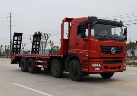 東風特商前四后八平板運輸車,8X4驅動,配置玉柴320馬力發動機,陜齒10檔變速箱,11.00R20鋼絲胎,13噸后雙橋,雙簧爬梯帶支腿,8mm防滑花紋板,橫梁120x120國際方筒,整車尺寸10950X2500X3200或者11980X2500X3700,平板寬度可裝手動伸縮或液壓伸縮到3米寬,爬梯可選裝液壓折疊式爬梯。平板長7.3米,最大載重35噸。