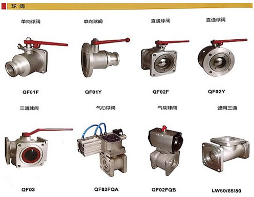 單向球閥QF01F、單向球閥QF01Y、直通球閥QF02F、直通球閥QF02Y、三通球閥QF03、氣動球閥QF02FQA、氣動球閥QF02FQB、濾網三通LW50/65/80。